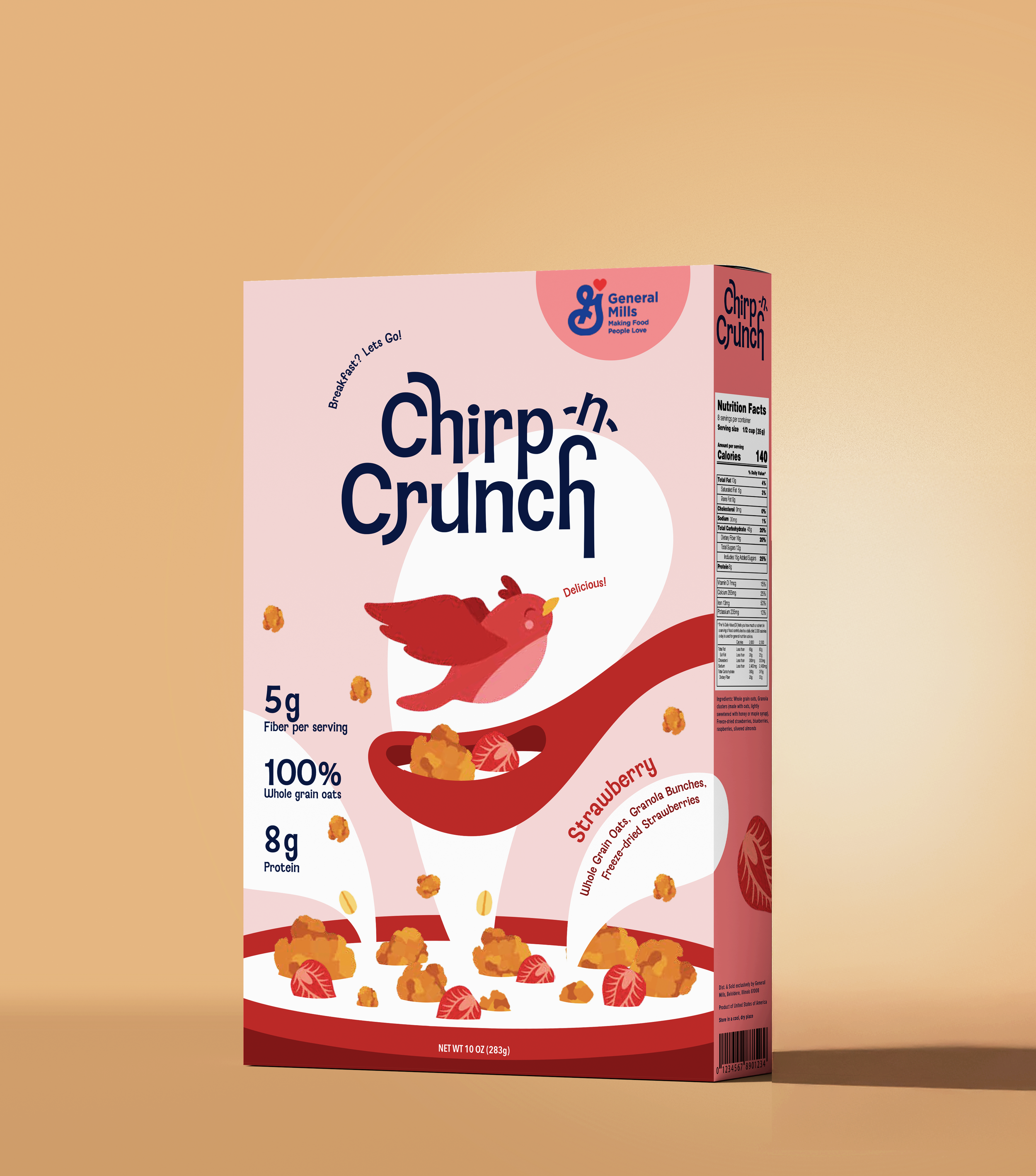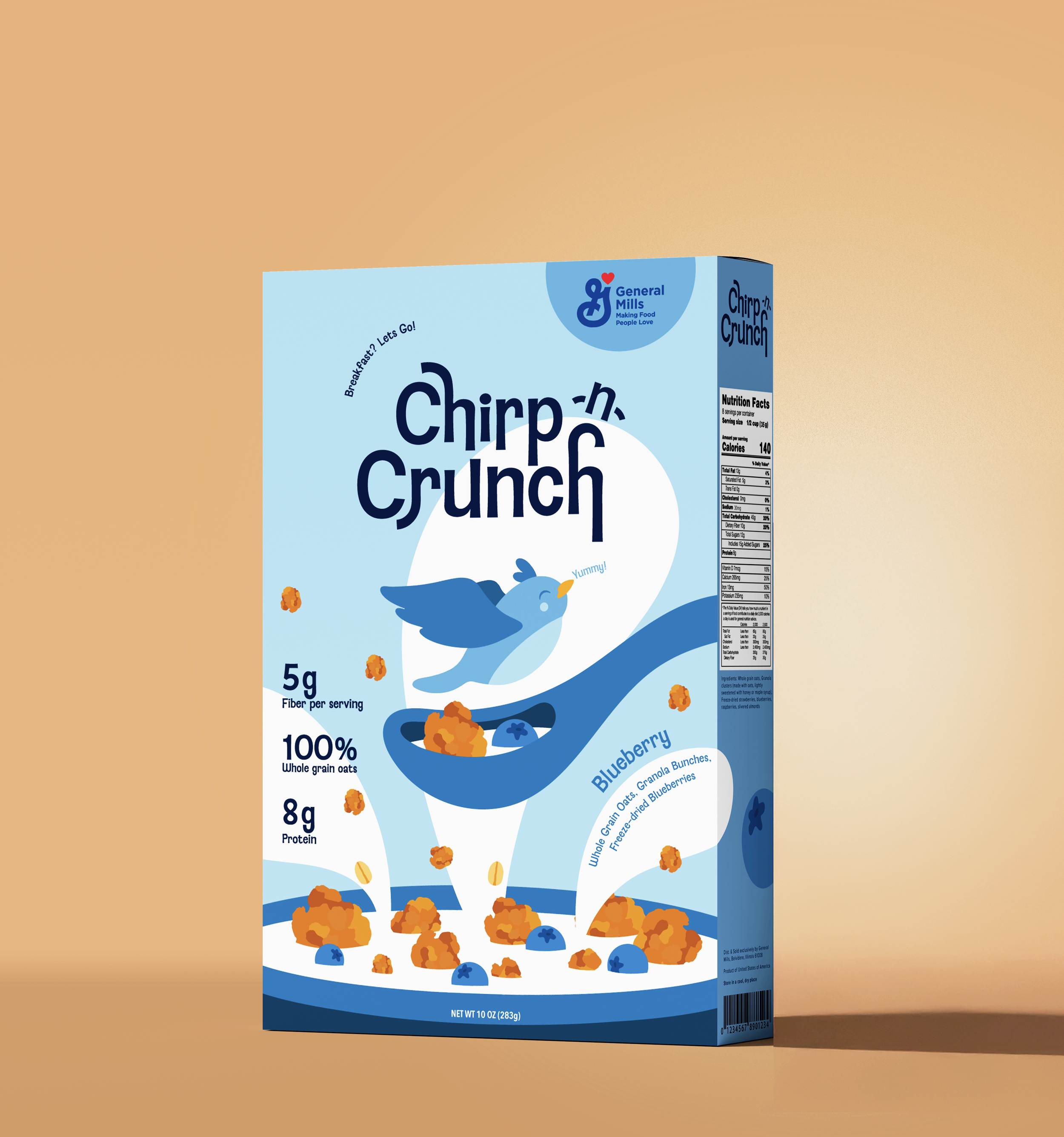 Chirp-n-Crunch is a cereal concept I created to address a common problem: many healthy cereals look dull or too serious on the shelf, making them less appealing to younger or more casual consumers. I set out to design packaging that felt fresh, organic, and fun. Something that instantly catches the eye and invites a positive start to the day.