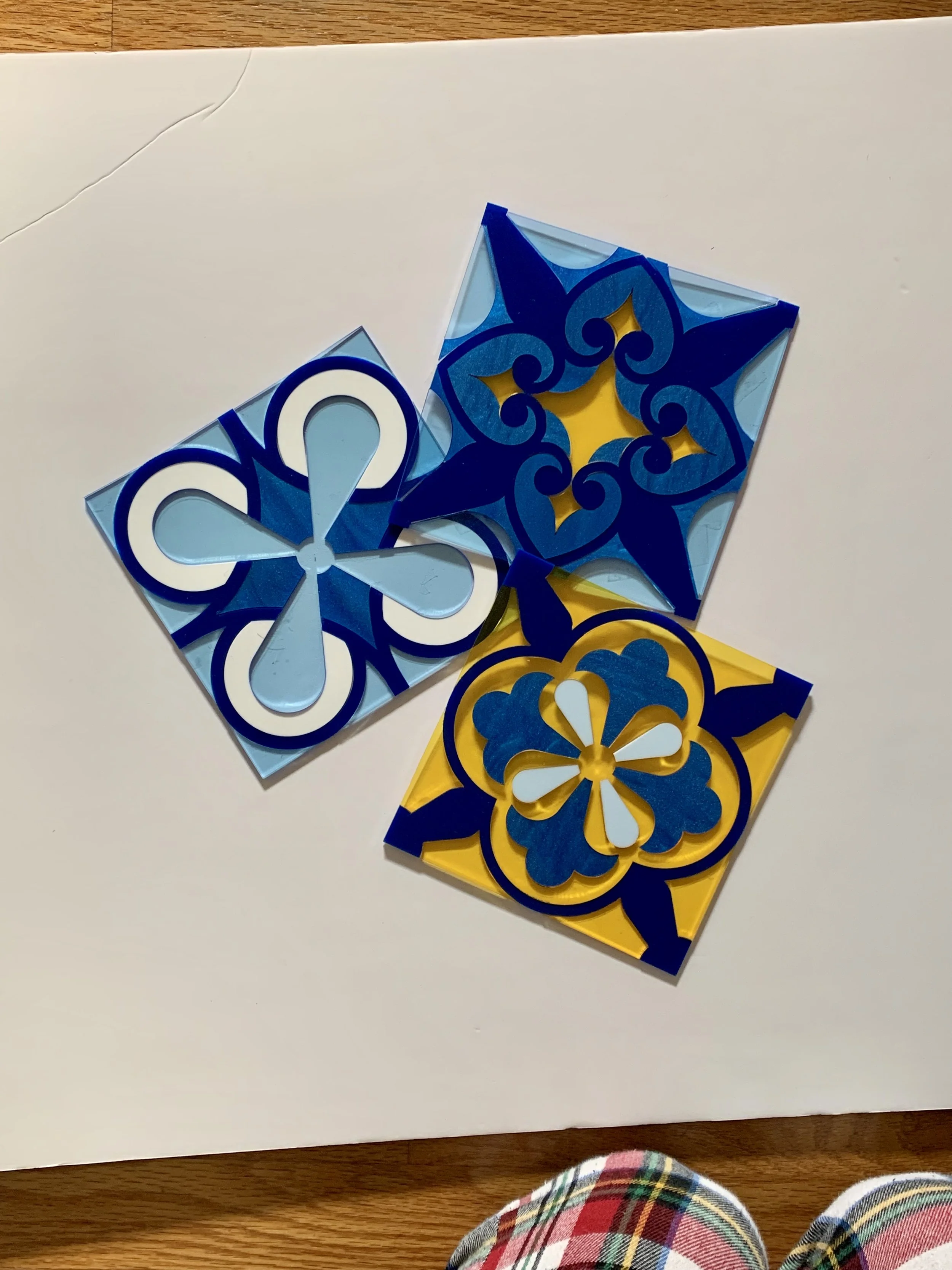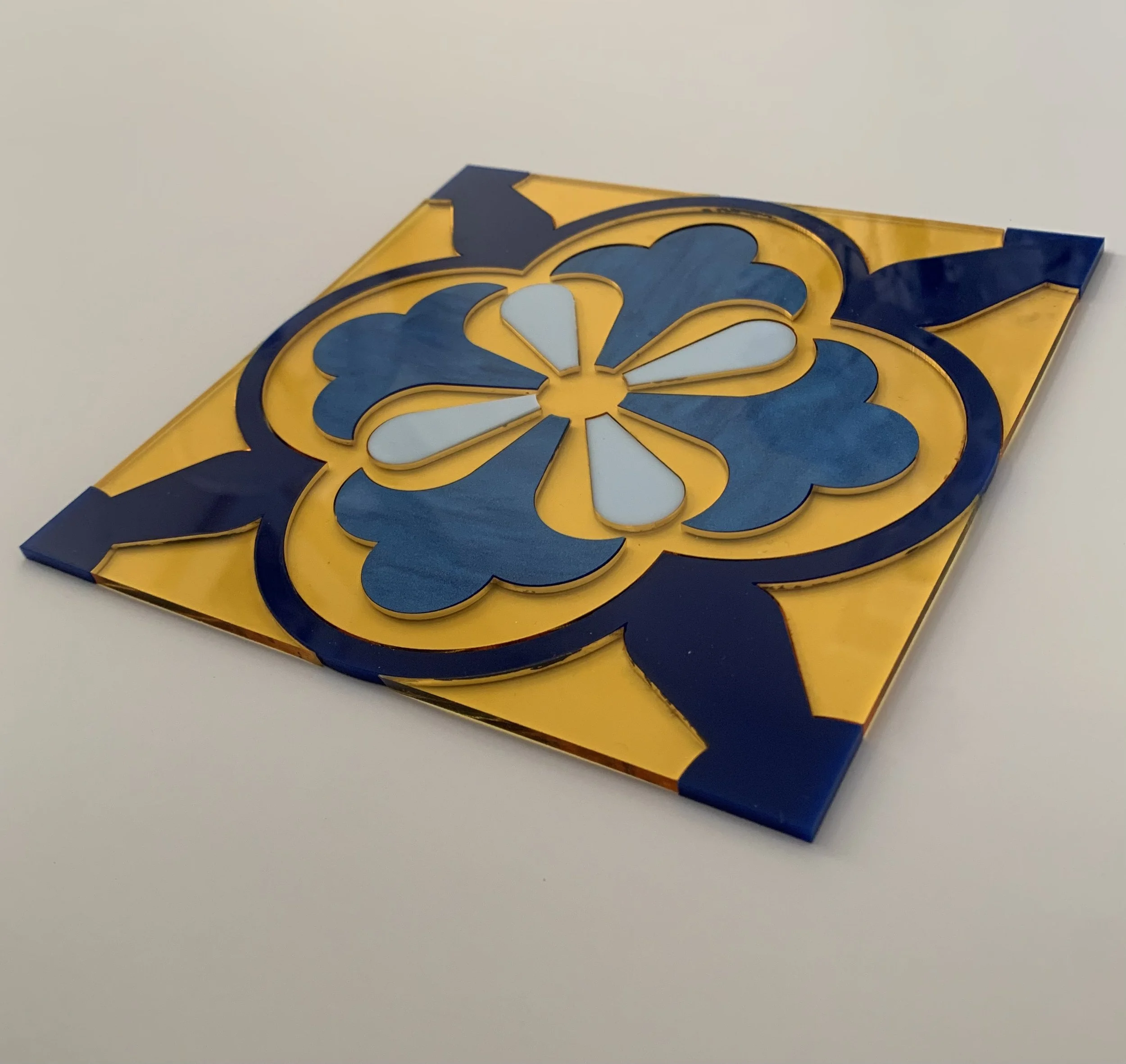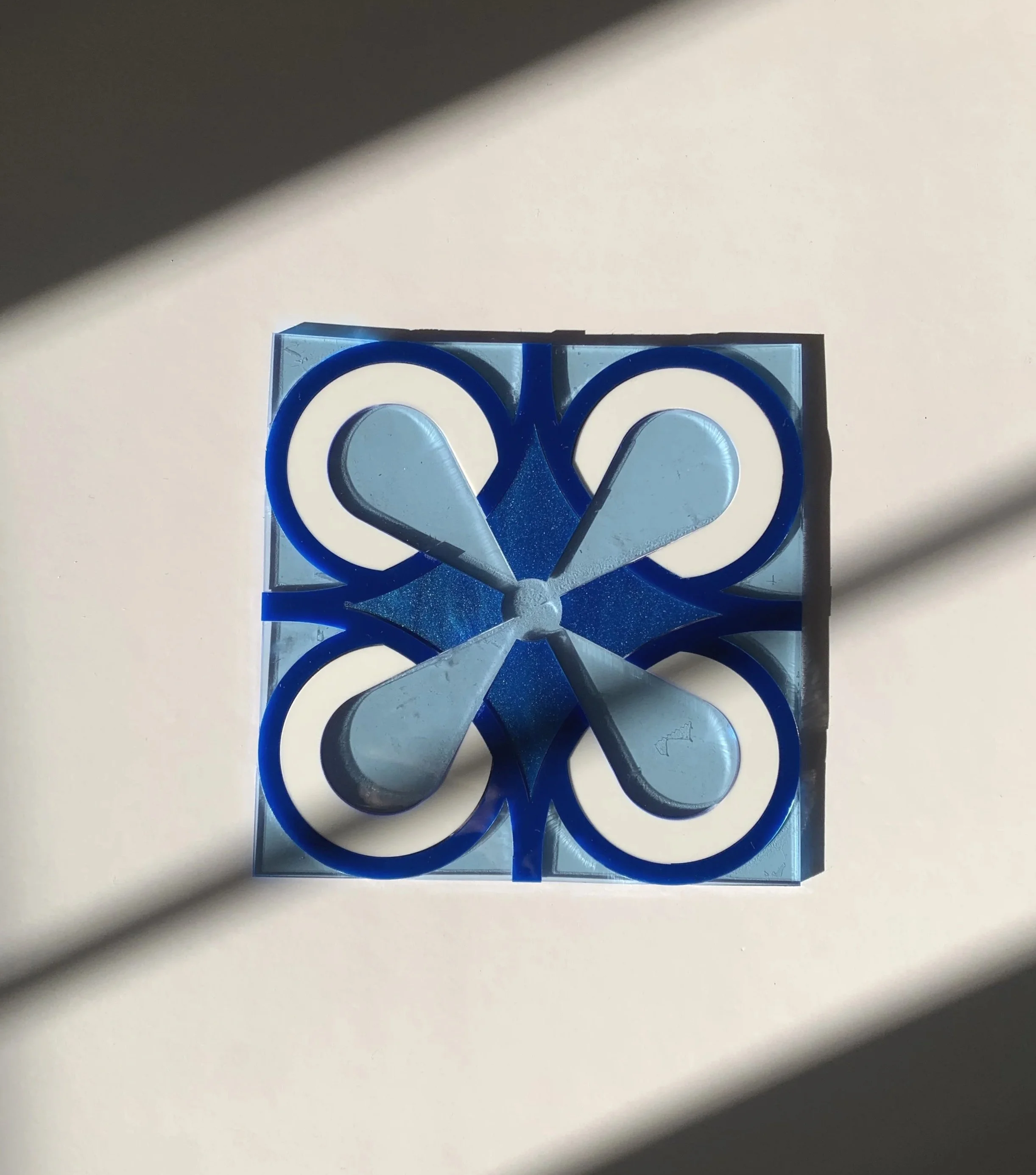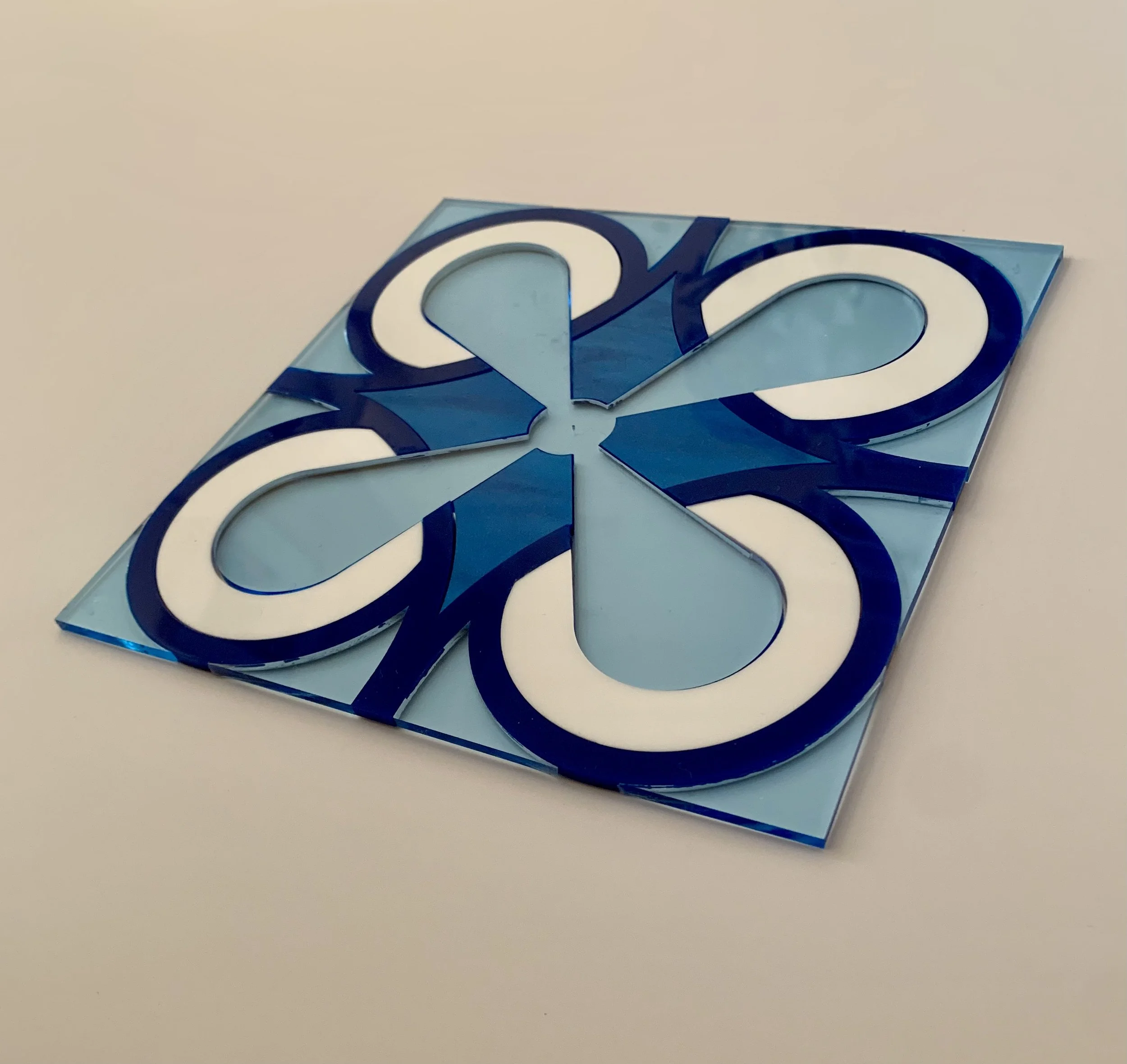A project completely ideated and designed by me. My senior project celebrates azulejo tile work as both a form of cultural heritage and a source of design inspiration. Through this reinterpretation, I aim to create my own tiles that bridge Portuguese tradition with contemporary design. My process begins with studying the history, symbolism, and techniques of azulejos, as well as their modern adaptations. Using a laser cutter, I reimagine traditional tile motifs through modern technology and materials, specifically by producing tiles from various colors of acrylic.